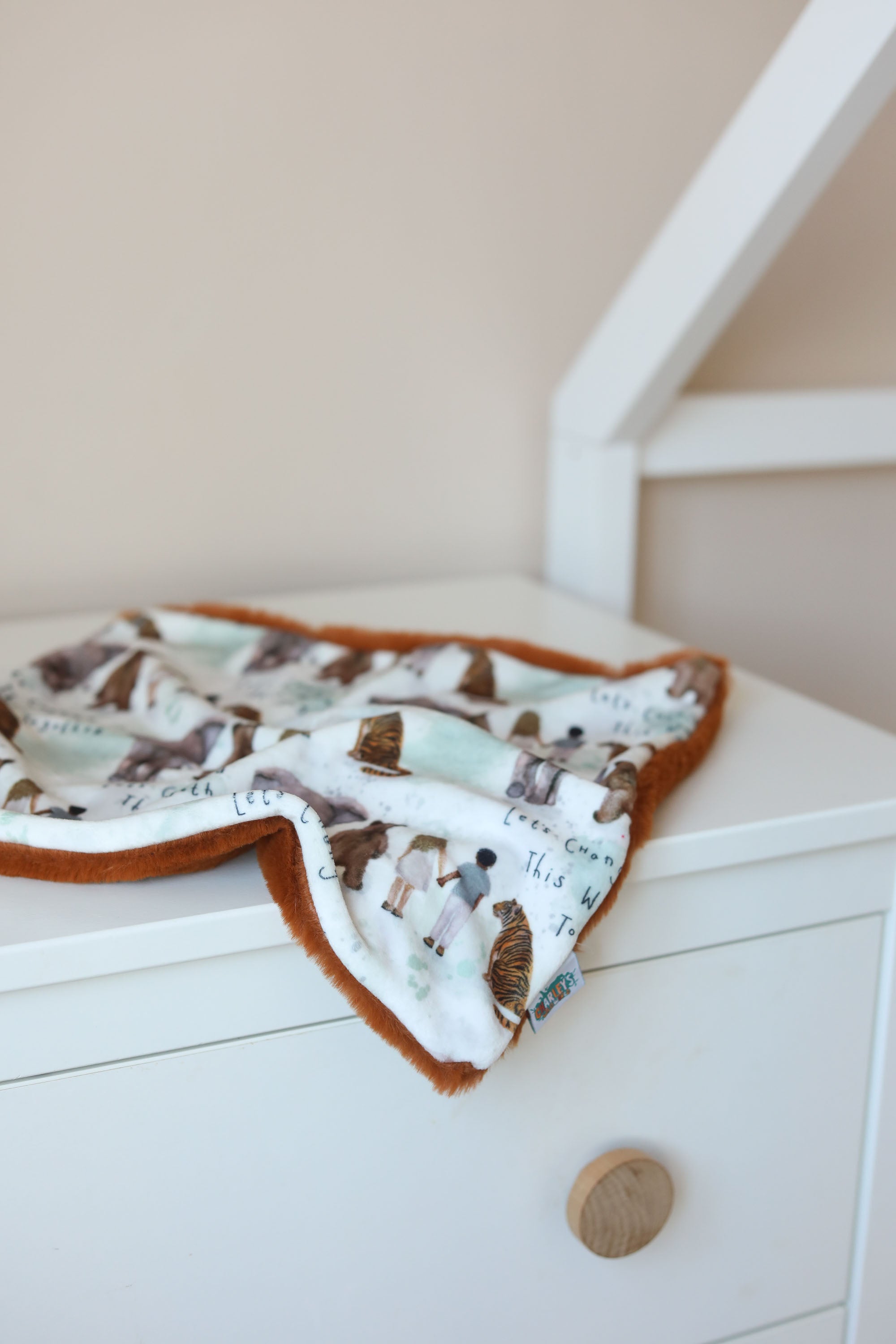 Due to the two fabrics being different compositions — the minky fleece being stretchy and the faux fur not — the comforters will not be perfectly symmetrical. It’s part of their handmade charm and does not affect use or snuggle factor!
